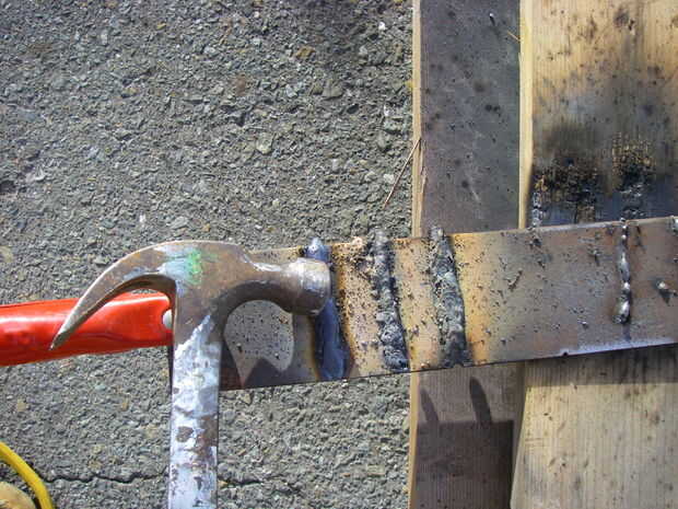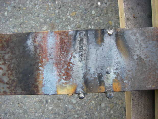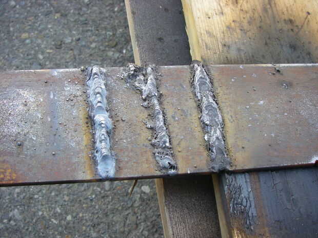 El desorden en la parte superior de la soldadura media trata de 6011 a 24 voltios. No hay suficiente jugo, muchas salpicaduras. El grano largo junto a él es un 6011 en 30 voltios.