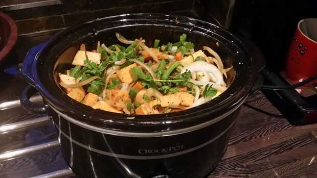 Lavar, cortar y trocear las verduras según su preferencia. Prefiero tener pedazos más grandes de verduras, como no se desintegra en la olla. Poner todos los ingredientes anteriores, incluyendo acciones, jugo de vegetales, Quorn, granos y especias y encienda la olla. Salí de mina 'Alto' para 4 horas, antes de agregar la quinua semicocida. Dar a la mezcla un buen revuelo, mezclando los jugos y cocer durante una hora más.