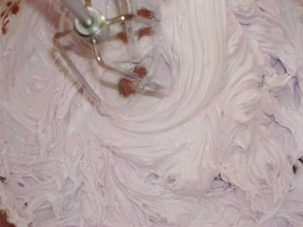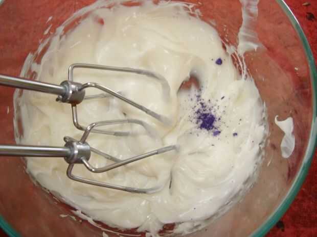 Retire la mezcla del refrigerador. Agregar colorante, usé unas escamas desde la sombra de ojos púrpura y no color de mi piel. Fue muy bonito en la botella! Mezclar bien. Batir de nuevo durante 2 minutos. Enfriar durante unos minutos.