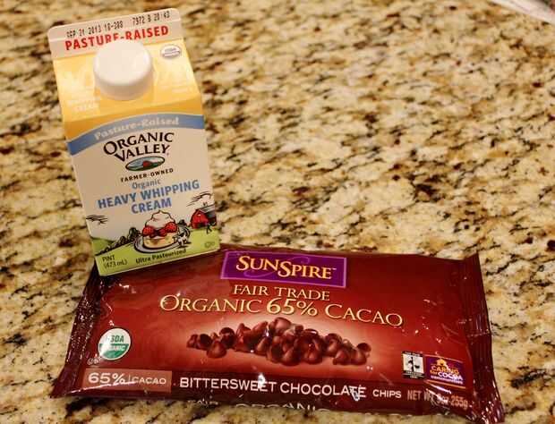 En una taza de medir de pyrex vidrio seguro de microondas, mezclar ambos ingredientes. Microondas en alta durante 60 segundos. Retirar del microondas y revuelva hasta que totalmente liso. Las virutas de chocolate se derriten en la crema caliente como revuelva. Seguir revolviendo hasta que quede brillante y suave.