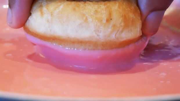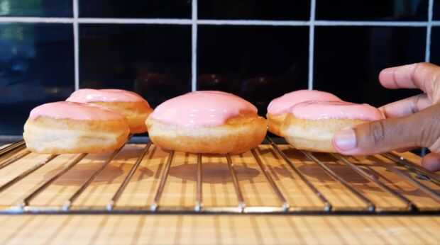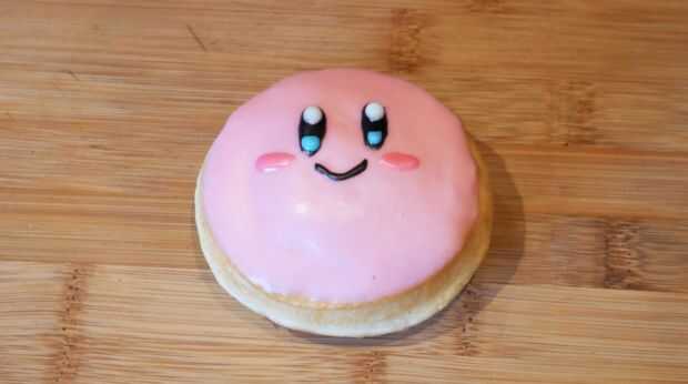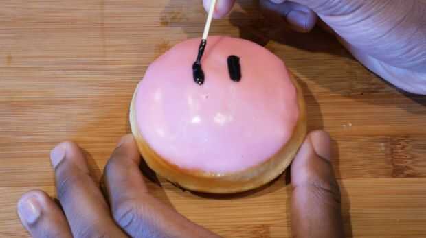 Mezclar el azúcar glas, leche y vainilla extracto juntos. Añadir los alimentos de color rosa colorante a la formación de hielo y mezclar. DIP el las donas en el glaseado rosa y deja secar. Mix junto blanco, negro y azul hielo y uso un palillo de dientes para dibujar en la cara de Kirby'a.