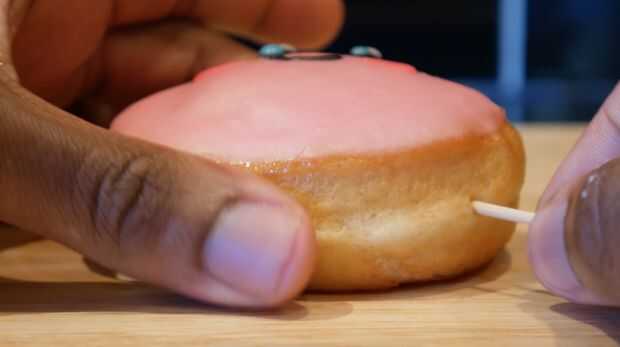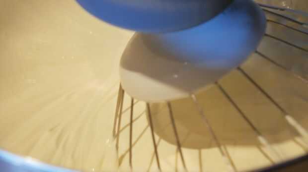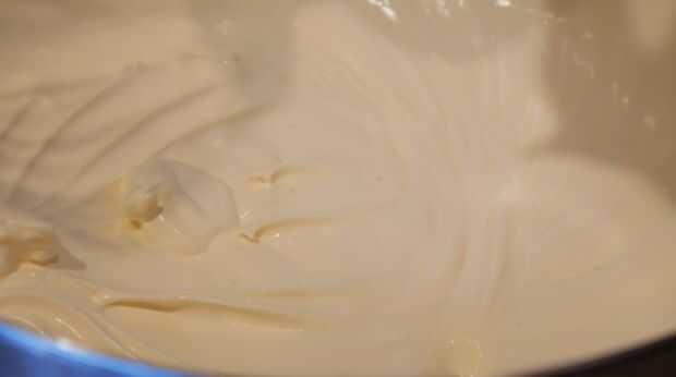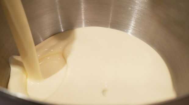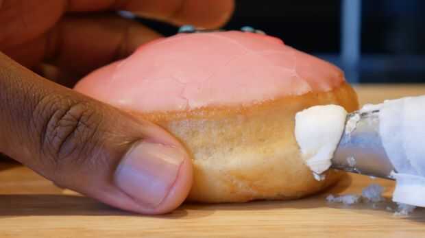 Añadir todos los ingredientes a una batidora y batir hasta que la etapa de pico suave. Haga un orificio en el lado de las donas y la nata dentro de la tubería.