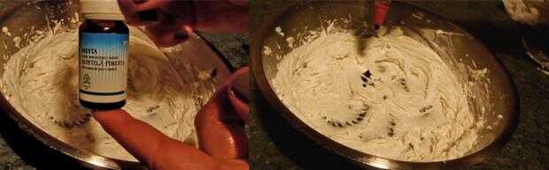 • Añadir unas gotas de aceite esencial de menta. 1/3 de mi mezcla, estoy utilizando 5 gotas. Así que si se desea hacer esto para toda la mezcla, necesita 15.