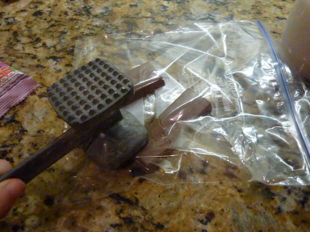 Desenvuelva las escapadas y ponerlos en una bolsa de plástico y séllela. Luego usar el martillo cosita para aplastar a las barras de chocolate hasta que son sólo migajas. Abra la bolsa y verter las migas en el tazón de la batidora.