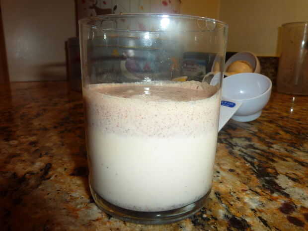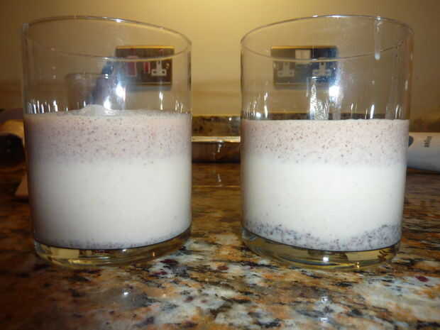 Se mezclan todos los ingredientes, luego Vierta la mezcla en 1 vaso grande o 2 pequeños vasos.