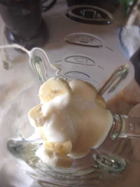 Ahora el plátano y cortar por lo que puede mezclar más fácil. Y al igual que la ciruela, no mezclar demasiado bien en su propio, así que añadir aproximadamente 2 cucharadas de yogur de amontonamiento. Usted puede Agregar tanto como quieras, pero me encontré con esto sea suficiente.
