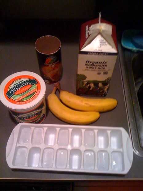 2 tazas de leche 2 plátanos (pelados) 3 cucharadas de yogur (vainilla) de amontonamiento 4 cucharadas de chocolate en polvo de amontonamiento 6 cubos de hielo