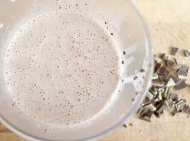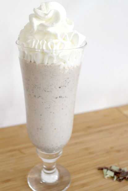Vierta el batido en sirviendo copas y cubra con crema de látigo y dulces de menta picados.