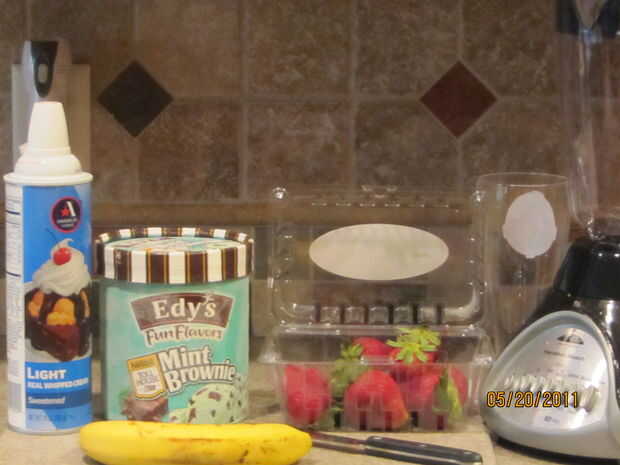 Para hacer este licuado necesita 2 cupes de helado de menta, una media taza de leche, 1 banna, 4 fresas, 3-6 cubos de hielo, crema batida de 1/2 taza y 2 cucharadas de jarabe de chocolate hershys.