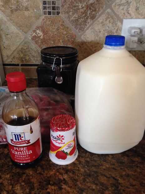 este licuado es una delicia refrescante, dulce y saludable que tiene buen sabor en un día caliente de verano!Paso 1: materiales Yogur de vainilla 1) 2) hielo 3) azucarada, fresas o frutillas regulares. (Sugared Strawberries Preferred) 4) nata 5) Blen