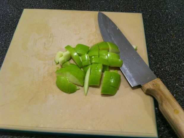 Corte la manzana verde en rodajas pequeñas.