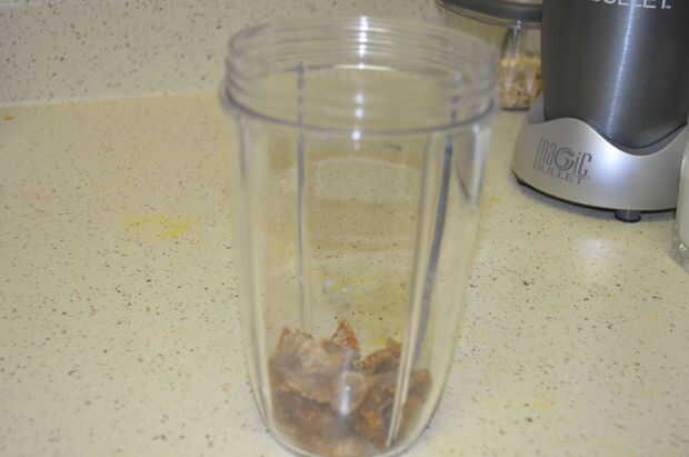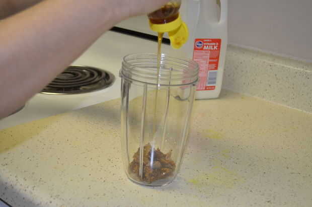 1) Fig (5 pedazos de higo seco), miel (cuchara de la tabla 3), se añade azúcar de caña (1 cucharita), leche (3/4 taza) en una licuadora.
