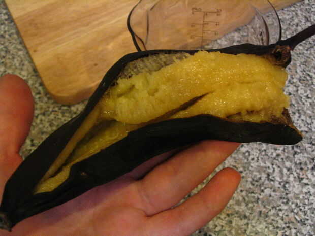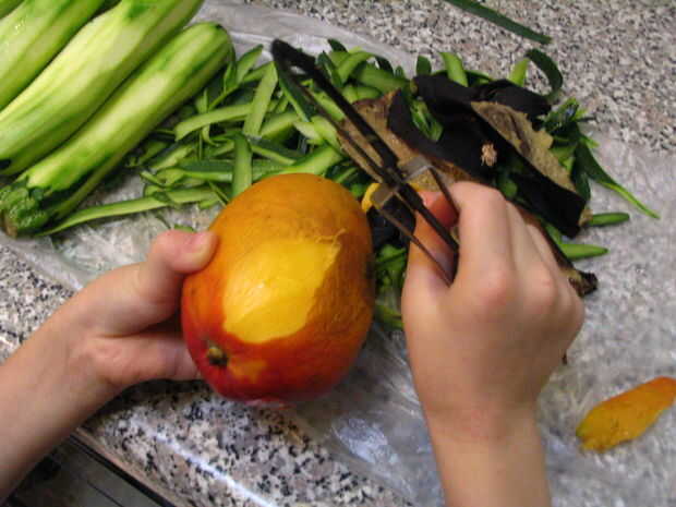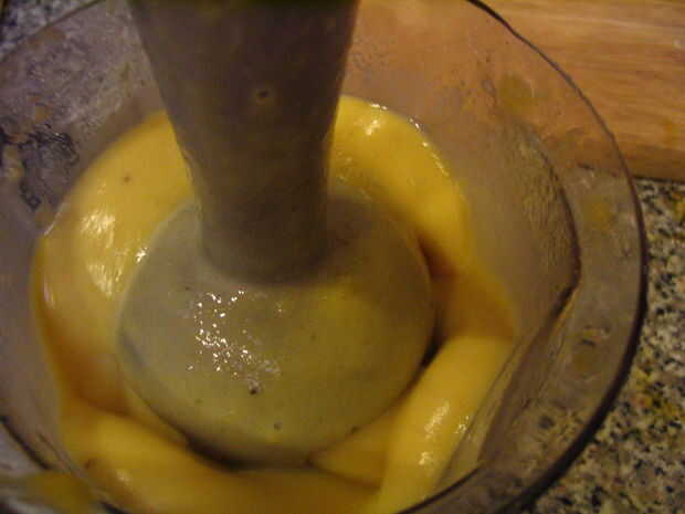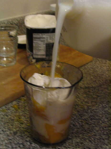 Pele y corte el mango. Pela 2 plátanos. Ponga el plátano y mango en licuadora.
