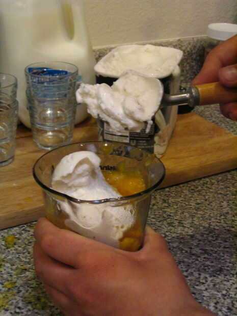 Añadir 2 cucharadas de helado. Vierta aproximadamente 1 taza de leche en la licuadora. Mezcla muy bien. Añadir azúcar al gusto.