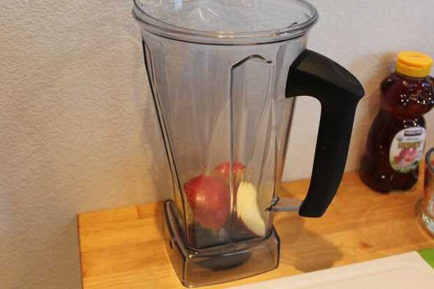 Si ya sabes cómo cortar una manzana (como espero que hagas) entonces no tienes que mirar muy cuidadosamente estas instrucciones. En Resumen, cortar la manzana de la base y luego ponerlo en la licuadora.