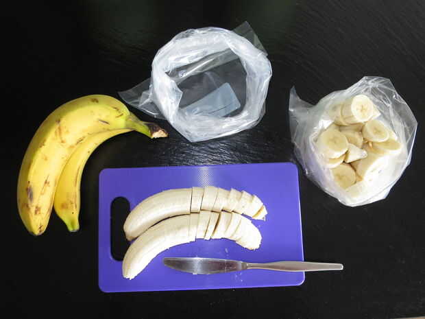 Así que, básicamente basta con congelar los plátanos. Me gusta despedazar en trozos más pequeños, para que sea más fácil para mi batidora de mano más tarde.