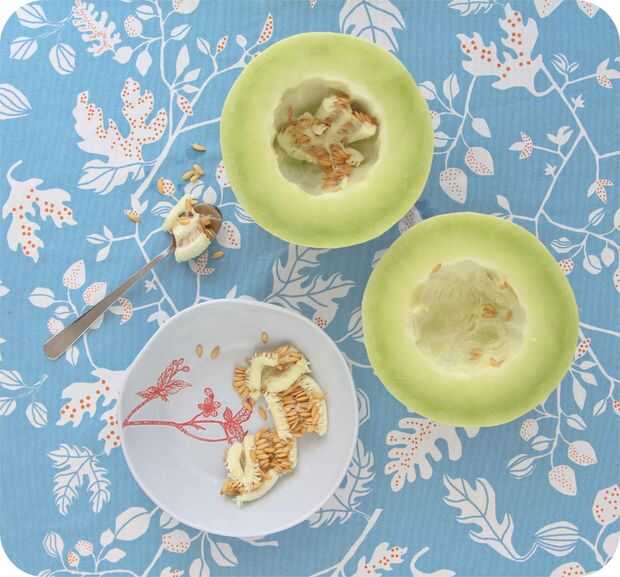 Cortar el melón por la mitad y luego retire y deseche las semillas con una cuchara de metal.