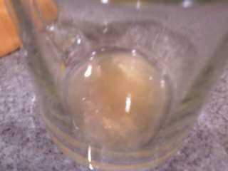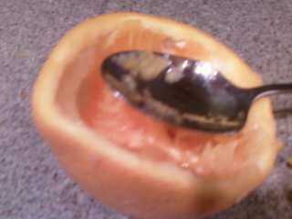 Ahora a sacar los interiores (de una de las mitades) de la naranja hacia fuera. Vierta el reamaning jugo de naranja de la naranja sacada con pala hacia fuera en una taza.