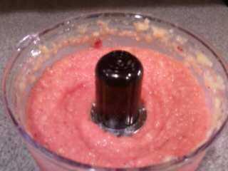a continuación mezcla la fruta y las naranjas hasta que no queden grumos, es cremosa y se ve como la imagen de abajo. Si el color no es color de rosa bastante, añade más fresas pero no añadir demasiado porque entonces el color será muy oscuro.