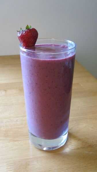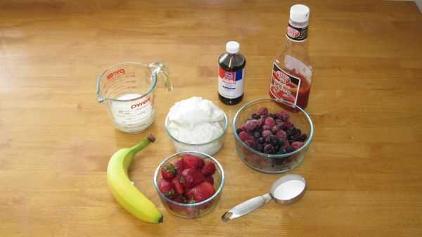 -1.5 tazas de bayas mezcladas congeladas (frambuesas, arándanos y moras, en este caso).  Esto es aproximadamente 2/3 de un paquete de 16 onzas de bayas mezcladas congeladas.