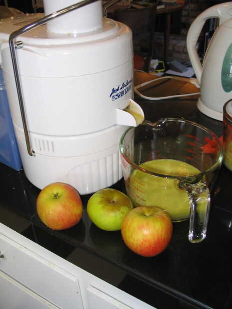 Jugo suficientes manzanas para hacer 500 mL (2 + tazas) de jugo. Planeé hacer aprox. 1,25 L (5 tazas) de los batidos porque es cuánto líquido mi licuadora tiene.