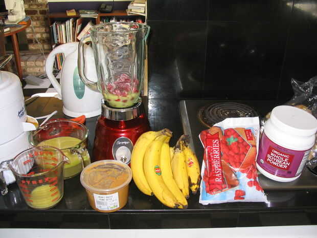 20 g más o menos de soja en polvo (porque me gusta el sabor arenoso, calcáreo de los batidos de "poder de la proteína")
