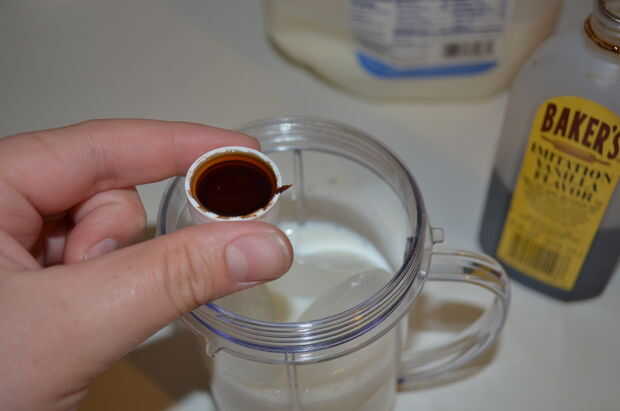 Poner los plátanos cortados en una taza grande de solución mágica. Poner en los cubos de hielo y agregar la leche hasta que casi no puede ver las puntas de los cubos de hielo. Ahora añadir sobre 2-3 tapas de vainilla extracción.