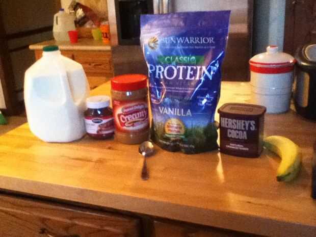 1 cucharadas de mantequilla de maní * ver foto de amontonamiento 1 cucharadas nutella plátano 1/2-1 (yo prefiero 1/2) (opcional) 1 cucharadas polvo de coco 1 cucharadas polvo de proteína 3-4 cubos de hielo (esto es lo que uso puede utilizar más si te gusta de esa manera) 2 tazas de leche