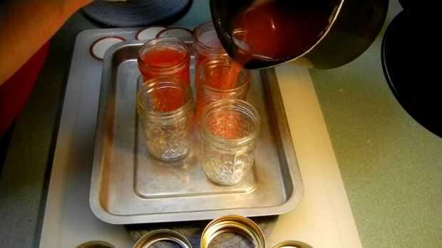 con extrema precaución y horno, volcar el contenido de la primera olla a través de la coladera en el segundo bote.  Revuelva el líquido en el colador con el fin de persuadir el líquido a través de.  Cuando que usted haya terminado, quedará con un líquido semi transparente, rosa.