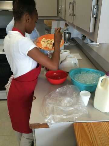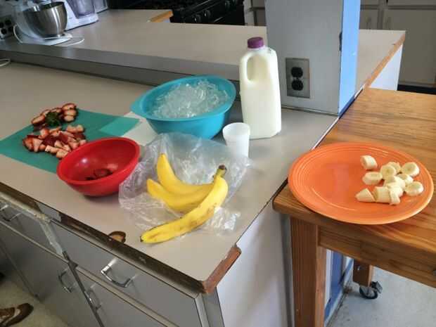 cortar plátanos y dados fresas y ponerlas en la licuadora.
