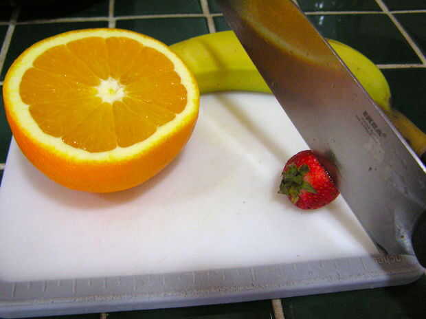 Recoger sus herramientas y los ingredientes, luego picar la fruta en trozos pequeños. Tu naranja debe ser cortado en octavos, sus fresas deben ser sin tallo y su plátano debe ser cortado en rondas gruesa 1/2 pulgada. Asegúrese de quitar las cáscaras!