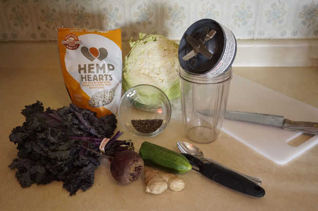 - 1-2 hojas de col roja (para bulto por batido - puede usar col rizada verde o las espinacas si se prefiere)