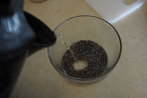 1. Vierta 2 cucharadas de caliente o agua caliente en las semillas de chia para dejarlos remojar