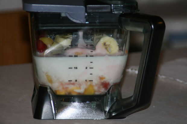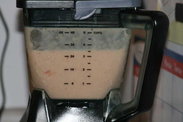 Primero que pones todo eso en la licuadora no importa lo que has puesto en primera. Esto hará que 5 tazas del batido.