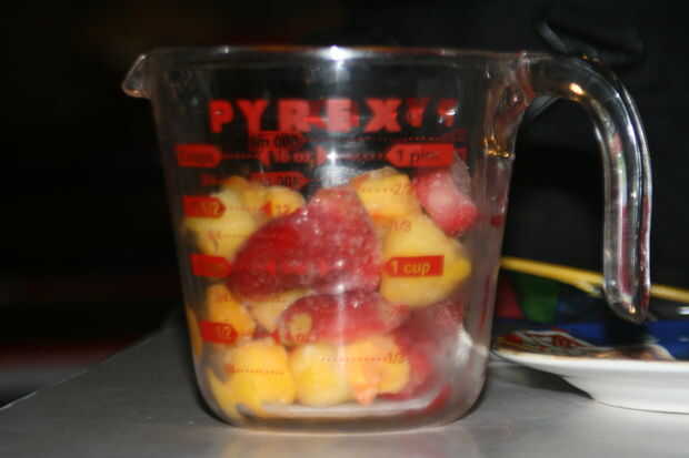 * 1/2 taza de mixedfruits bruja tiene fresas, piñas, mango y melocotones en él