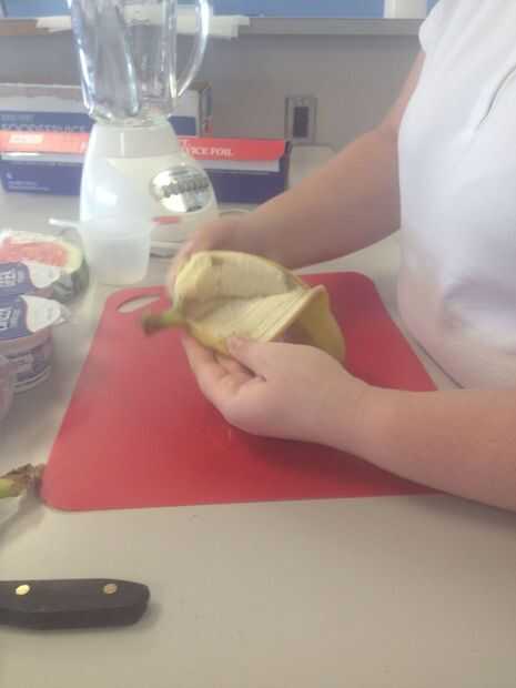 en nombre de mi hermana... Cómo hacer un batido de frutas tropical.Se necesita:ApplePlátanoDuraznosYogur de albaricoqueMezcla y disfruta!