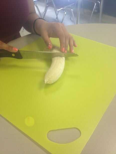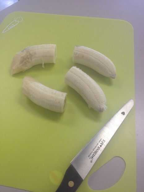 Pele los dos y ponerlos en una tabla de cortar. Cortar los dos plátanos por la mitad y ponerlos en la licuadora