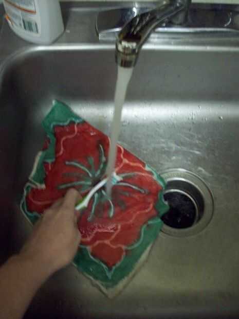 Una vez que haya terminado toda su muerte, tendrá que lavar la cola y el exceso de tinte. Esto se puede hacer en el fregadero. Usar agua caliente/caliente y un cepillo de dientes viejo para obtener de la cola hacia fuera. Si usted no puede conseguir cada poco de pegamento, eso está bien. Usé un poco muy pequeño de jabón en un momento cuando he tenido problemas, y parece que no afectan el medio de contraste (al menos demasiado). Una vez que haya terminado, todo lo que tienes que hacer es dejar que el tejido se seque!