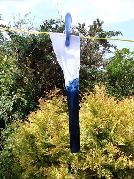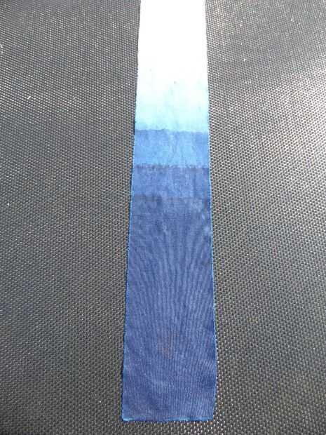 Es una buena idea para hacer una prueba con una tira de algodón. Intenté sumergir por 5 minutos y logró un buen azul, más sumerge aumentará la profundidad de la cortina.