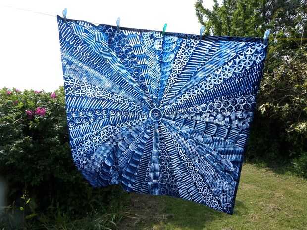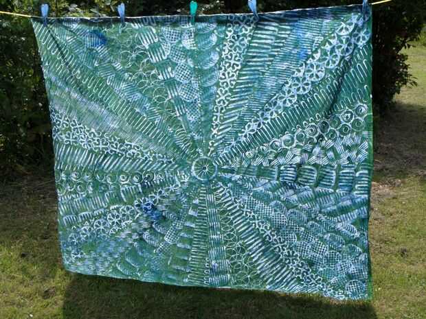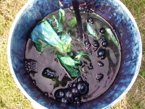 Luego baje lentamente la tela en el indigo IVA por 5 minutos o así, cuelga para arriba en una línea de lavado y permiten oxidar. La tela aparece verde y como golpea el aire cambia al azul! Siempre un momento mágico.