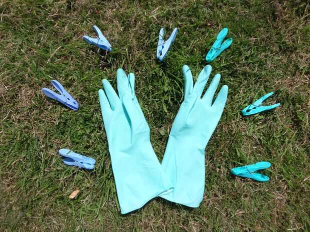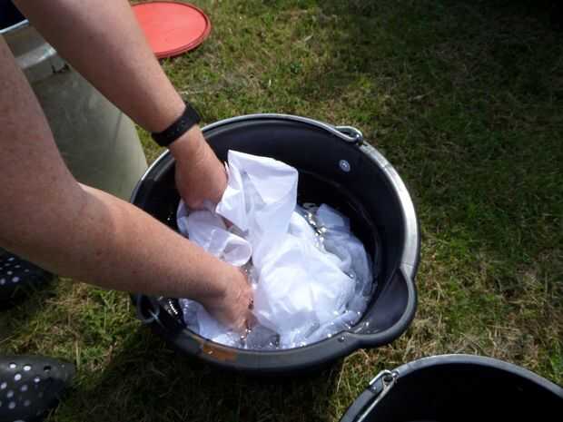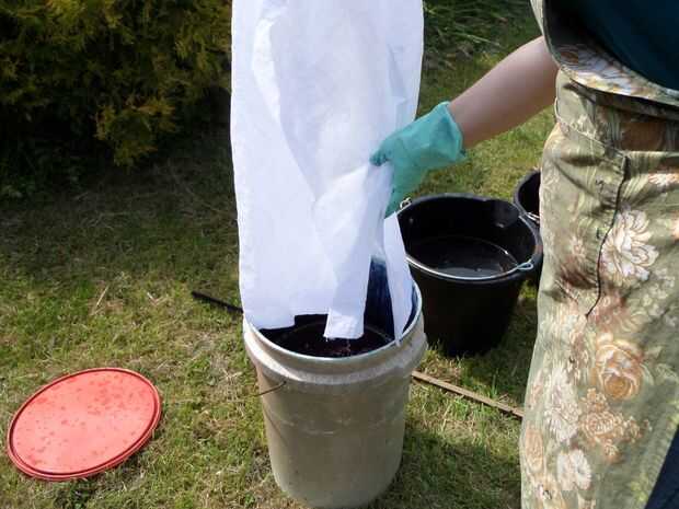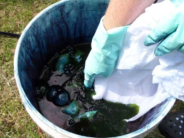 Con guantes de goma y plástico clavijas en la lista, primero moje la tela encerada-esto hace que el teñido más uniforme. Recomiendo hacerlo fuera en el jardín ya que puede ser sucio y huele a huevos mal!