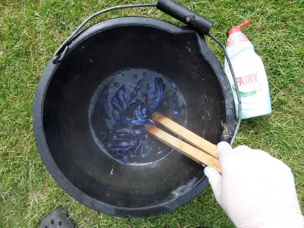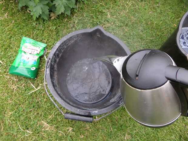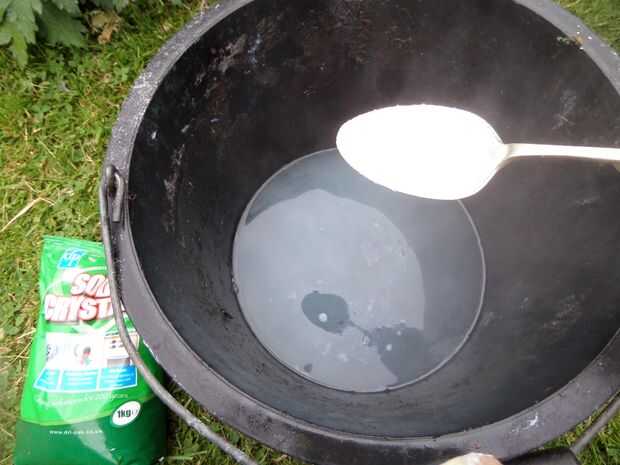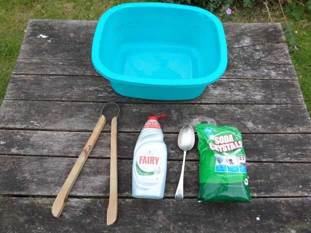 Usted necesitará un par de cubos, agua fría en un cubo segundo, agua hirviendo, un chorro de detergente líquido y una cucharada de cristales de Sosa. Algunas lenguas de madera y guantes de goma son útiles también.