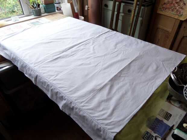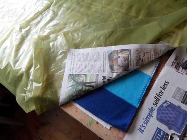 Estoy utilizando una manta sobre la mesa para darme una buena superficie para imprimir en. Coloque algún periódico y finalmente algunas láminas en la parte superior de plástico, esto permitirá que la tela encerada arrancar fácilmente.