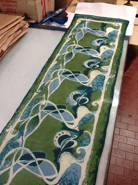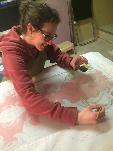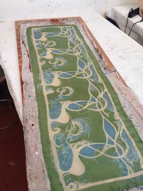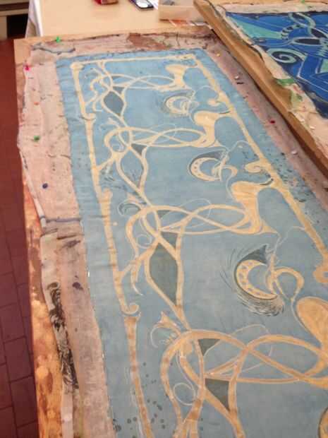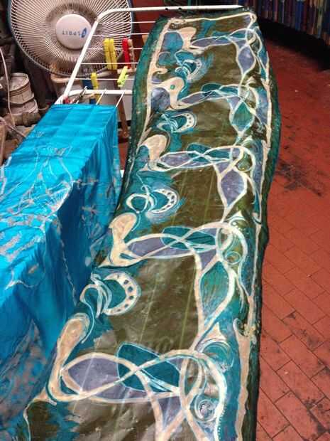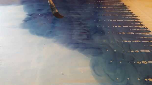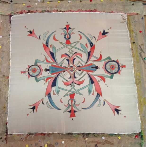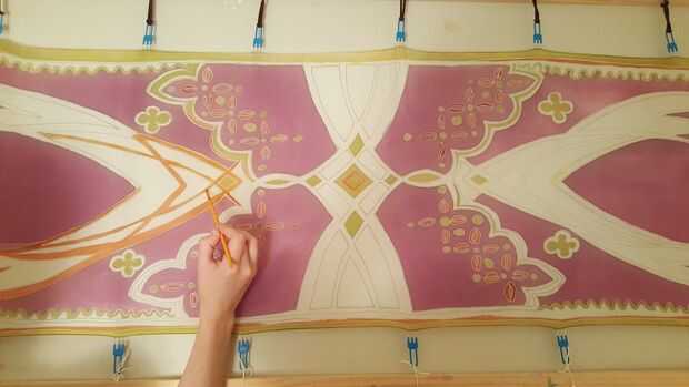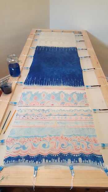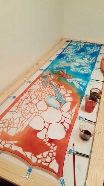 Aquí viene la divertida pieza, que es la adición de color a la tela. Colorante actúa similar a la acuarela cuando pintado en seda. Si gota colorante a una porción de la seda donde hay no hay cera para actuar como una barrera, se purga a través de la tela bastante lejos, antes de que se detenga. Los actos de cera como un esbozo o una pared pequeña, por lo que el tinte permanece en un área determinada, como una coloración diseño. Mediante la adición de agua a la tintura que se puede manipular la textura en la tela, cambie el valor del color, o se mezclan diferentes colores, al igual que una pintura normal.