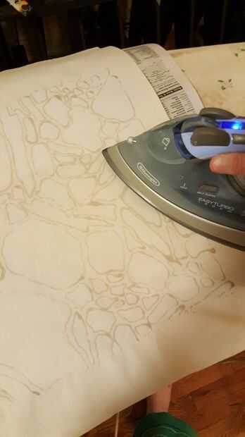 Una vez tengas tu diseño pintado, el siguiente paso es derretir de la cera de la seda. Esto puede hacerse fácilmente mediante el uso de una plancha que no importa tanto (porque pondrá sucio con cera con el tiempo) y hojas de papel de periódico o diario. Coloque su bufanda sobre la tabla primero, luego coloque el papel en la parte superior. Una vez que el hierro es calentado, todo lo que tienes que hacer es de hierro sobre el papel y la cera comenzará a derretirse y salir en el papel. Si tu bufanda tiene un montón de cera desde el diseño, pueden tomar unas cuantas hojas de papel para obtener la cera de la tela. Una vez retirada la cera, se quedan con las áreas donde el tinte no llegó a la seda, como se muestra en las fotos anteriores.