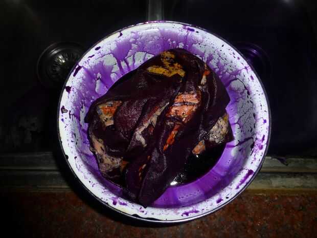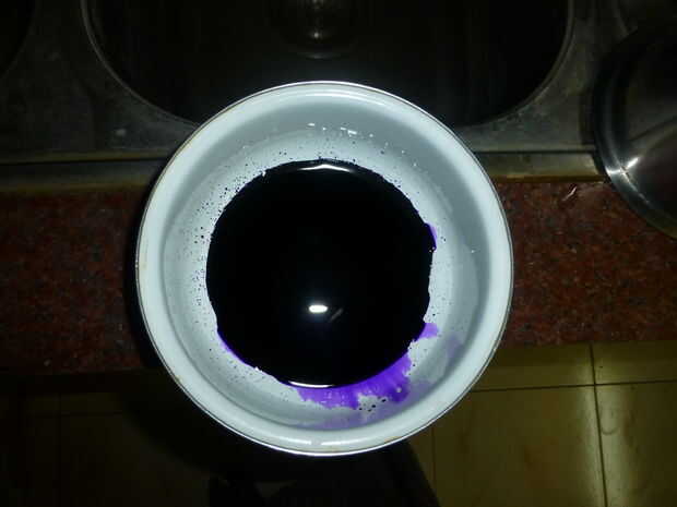 Tomar colorante azul en un recipiente y sumergir a la tela. Saque la tela teñida y colgar secar.