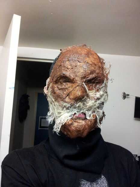Una vez que tienes tu varias capas de recubrimientos (creo que el mío tenía 8) se pueden recortar los agujeros de los ojos y alrededor de la cara. En este punto os adjunto las dos partes (cara superior y mandíbula inferior) a una campana de algodón (piensa en una máscara de ninja) con pegamento caliente en la posición correcta de la cara.