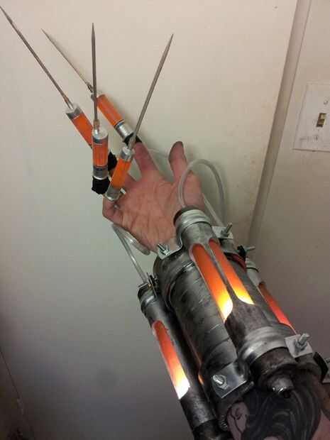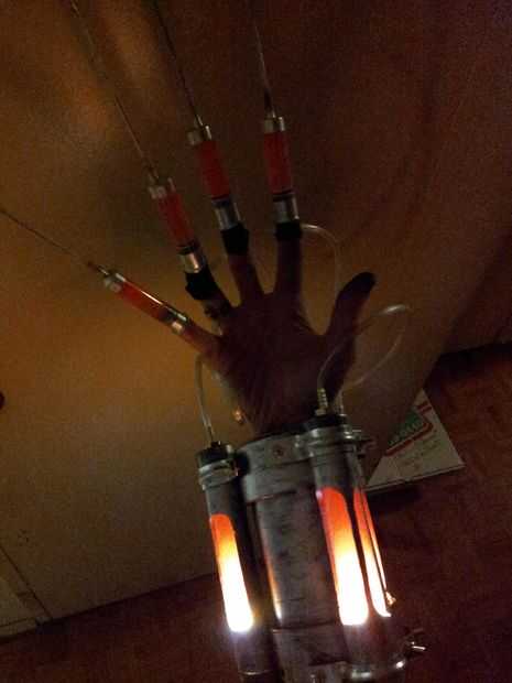 Para hacer los dedos de aguja, usé 4 jeringas de Pee dee que recogí en la farmacia. También pinté las tapas y fondos de las jeringas para parecer vieja "arpón jeringas" para las agujas se pintaba sólo pinchos de brocheta. y caliente pegado en las jeringas.