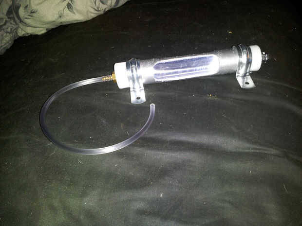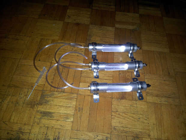 Los cuatro tubos de la pecera se llena con la misma tinta naranja y parados en ambos extremos con pegamento caliente. Luego le enchufamos un extremo de los 4 en cada uno de los accesorios de tubería en las cámaras.