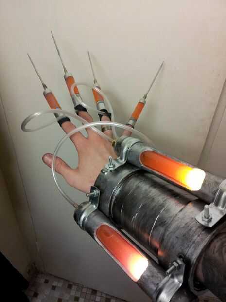 El "relleno" a las agujas y las tres cámaras en el brazo se hace de desinfectante de manos mezclado con la tinta de impresión naranja"(me han dicho que el gel de pelo naranja funciona de forma similar, pero estaba usando lo que tenia)